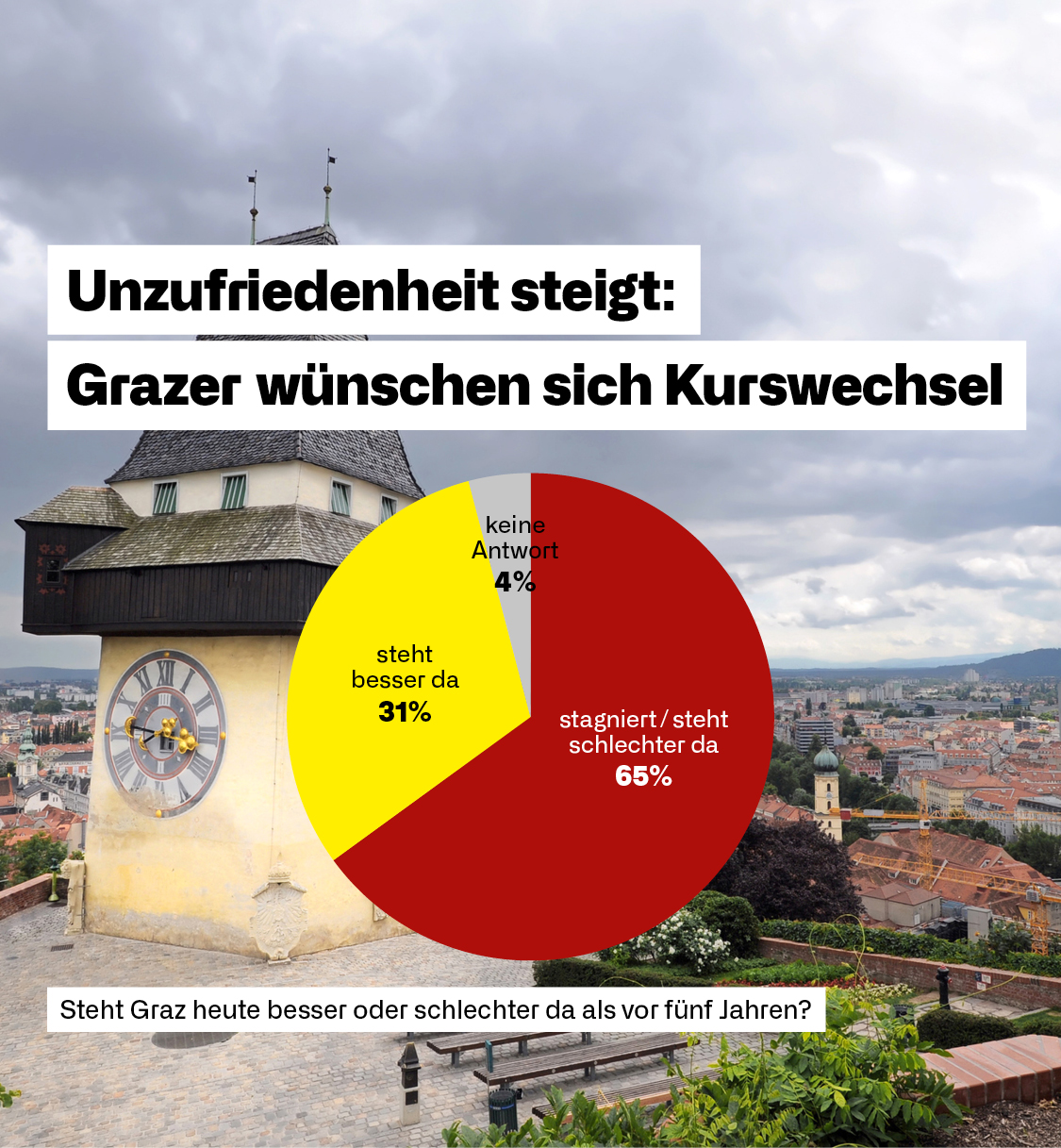 Eine aktuelle repräsentative Befragung von M&R Meinungsforschung mit 500 Befragten zeichnet ein klares Stimmungsbild für Graz. Auf die Frage, ob die Stadt heute besser oder schlechter dasteht als vor fünf Jahren, sagen lediglich 31 Prozent, Graz habe sich verbessert. 65 Prozent hingegen sind der Meinung, dass die Stadt stagniert oder sich sogar schlechter entwickelt hat.