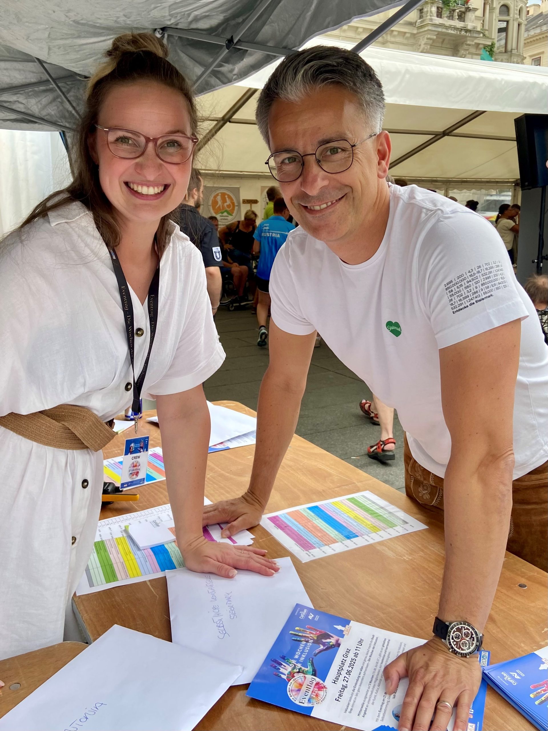 Inklusionsstadtrat Kurt Hohensinner mit Selbstvertreterin Bernadette de Rocha am Infostand der Wochen der Inklusion am Grazer Hauptplatz